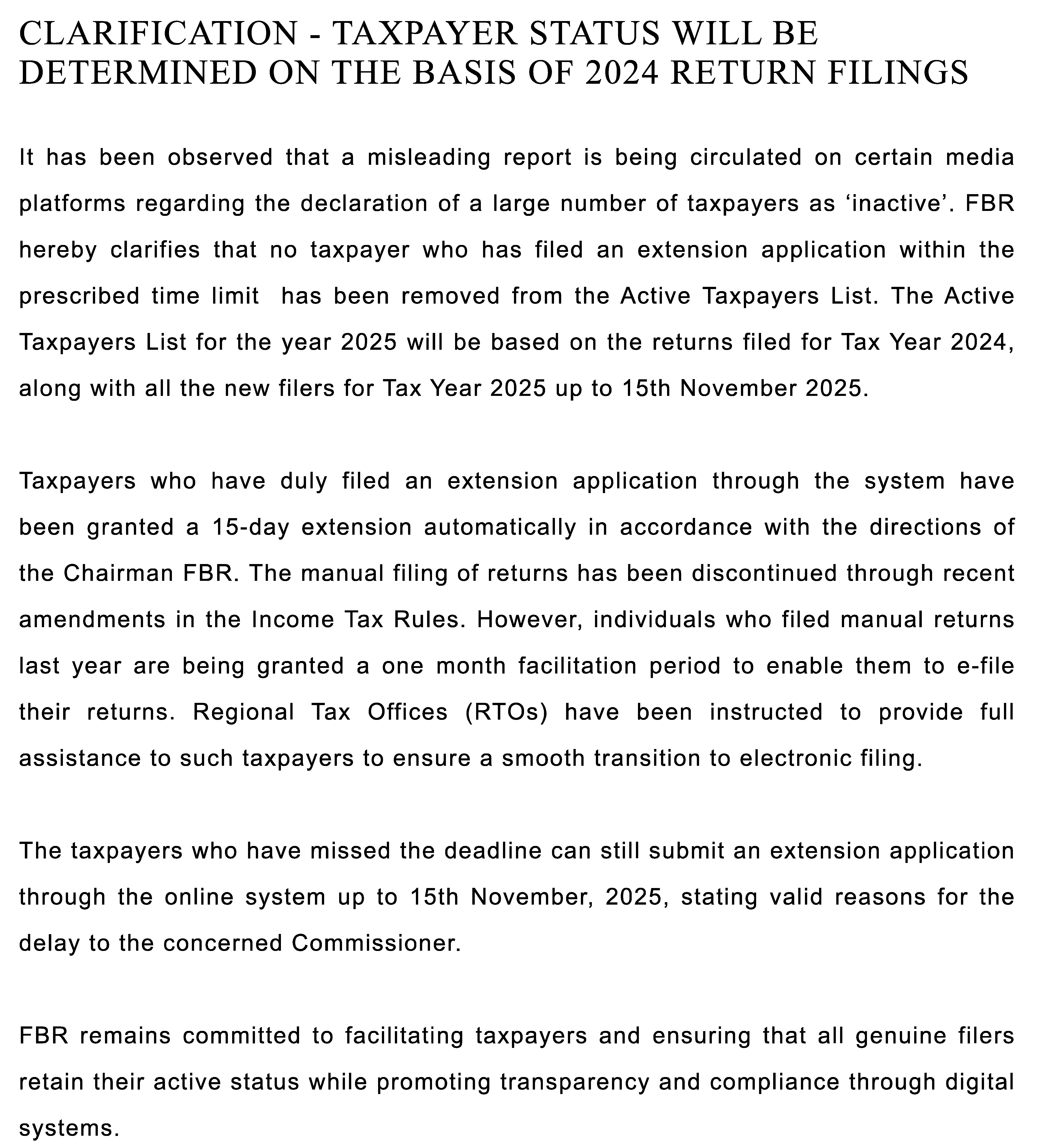 • The FBR issued a clarification press release on November 3 stating that the “Active Payer List” status will be determined based on the ITR filing of both 2024 and along with new filers for the year 2025.